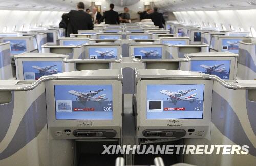 8月1日,在美國紐約肯尼迪國際機(jī)場,人們站在首航的阿聯(lián)酋航空公司的空中客車A380客機(jī)商務(wù)艙內(nèi)。新華社/路透