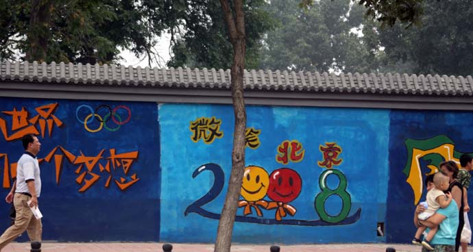 8月7日,人們從北京宣武區(qū)一處“北京奧運墻”前經(jīng)過。該墻長約300米,畫著有關奧運內(nèi)容的圖畫,寫有祝福北京奧運會的文字。