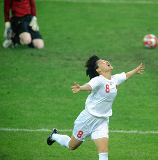 8月6日,中國女足球員徐媛慶祝進球。當日,在天津進行的奧運會女足E組的比賽中,中國女足以2比1戰(zhàn)勝瑞典女足。新華社記者:王曄彪 攝