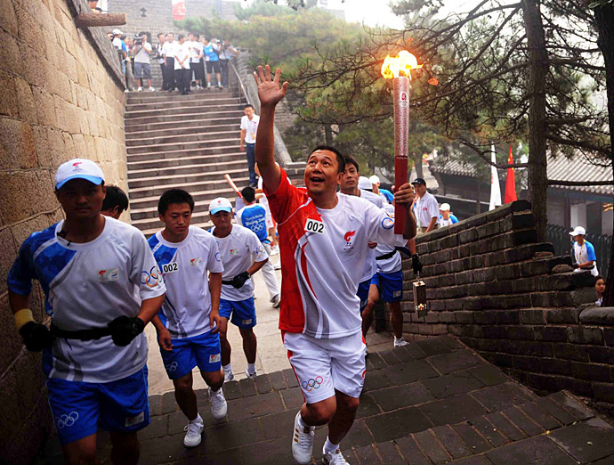 8月6日至8日,北京奧運火炬在京傳遞;鹁媸贮h強在進行火炬?zhèn)鬟f。