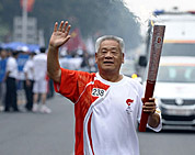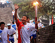 8月6日至8日,北京奧運火炬在京傳遞;鹁媸贮h強(左圖)、穆祥雄(右圖)在進行火炬?zhèn)鬟f。