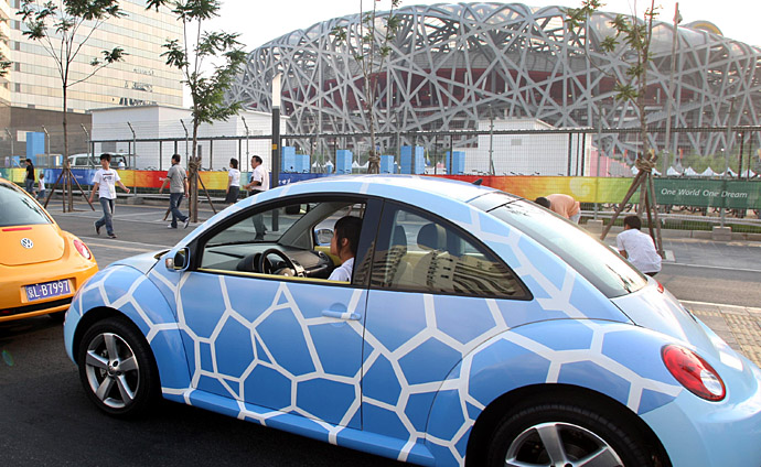 一支充滿“奧運中國”元素的車隊在“鳥巢”前的道路亮相,吸引了人們的目光。