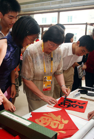 8月7日,國際奧委會主席羅格的夫人安妮·羅格女士(中)在北京四中參觀時親筆寫下“!弊。