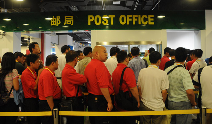 8月8日8時許,等待購買北京奧運(yùn)會首日封的人們在北京奧運(yùn)會主新聞中心(MPC)的郵局前排起長隊(duì)。此刻距北京奧運(yùn)會開幕還有12個小時。