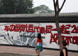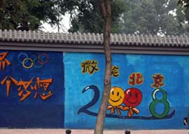8月7日,人們從北京宣武區(qū)一處“北京奧運墻”前經過。該墻長約300米,畫著有關奧運內容的圖畫,寫有祝福北京奧運會的文字。
