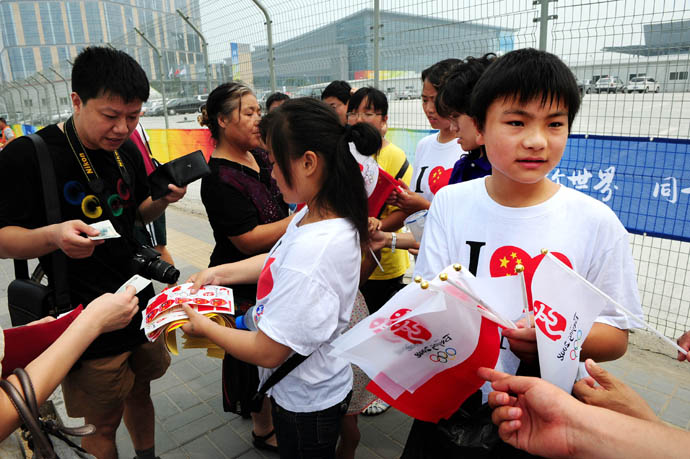 8月8日,人們在挑選旗幟。奧林匹克中心區(qū)附近張燈結彩、彩旗飄揚,來自海內(nèi)外的八方賓客歡聚一堂、喜迎奧運。此刻距北京奧運會開幕還有不到6個小時。