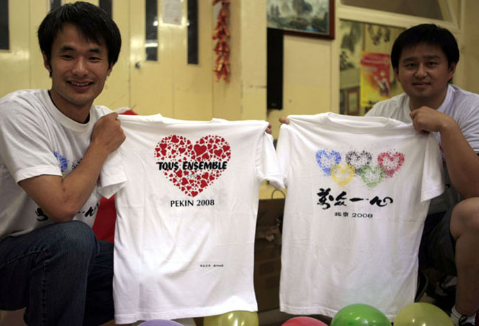 8月7日,兩名中國留學(xué)生在巴黎展示慶祝北京奧運會開幕的T恤衫。北京奧運會開幕式將于8月8日舉行,在法留學(xué)生和華人華僑社團正積極籌備慶祝奧運會開幕的各項活動。
