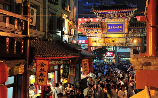 北京有首民謠唱道:“北京小吃九十九,樣樣叫你吃不夠!蓖醺〕砸粭l街各式小吃,沒有上百種也有九十樣。如新疆式烤羊腿、甜點驢打滾、油炸灌腸等回民小吃和煎餃子、爆肚、甜食茶湯和北方小點豌豆黃等各種食品。 特色推薦:一是炸蝎子、螞蚱、繭蛹,來王府井小吃一條街的食客們一般都會嘗試一下這看起來使人畏懼,但口感著實不錯的小吃。二是各式各樣的冰糖葫蘆,是這里色彩最豐富的小吃,品種多樣,有最傳統(tǒng)的山楂、桔子、山藥,還有新鮮的獼猴桃、草莓、葡萄等等,一路走來舉著它,突然找到了兒時的感覺。