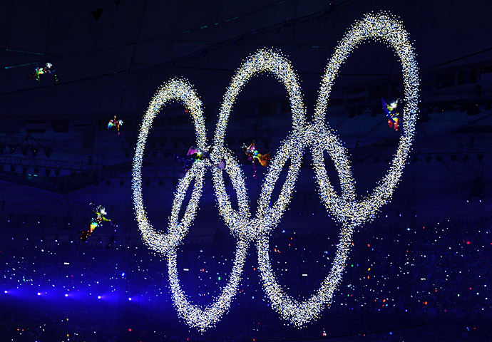 8月8日晚8時(shí),第29屆夏季奧林匹克運(yùn)動(dòng)會(huì)在國(guó)家體育場(chǎng)——“鳥巢”隆重開幕。這是開幕式上閃閃發(fā)光的夢(mèng)幻五環(huán)出現(xiàn)在“鳥巢”。