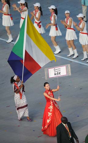 8月8日晚8時(shí),第29屆夏季奧林匹克運(yùn)動會在國家體育場——“鳥巢”隆重開幕。這是科摩羅代表團(tuán)在開幕式上入場。