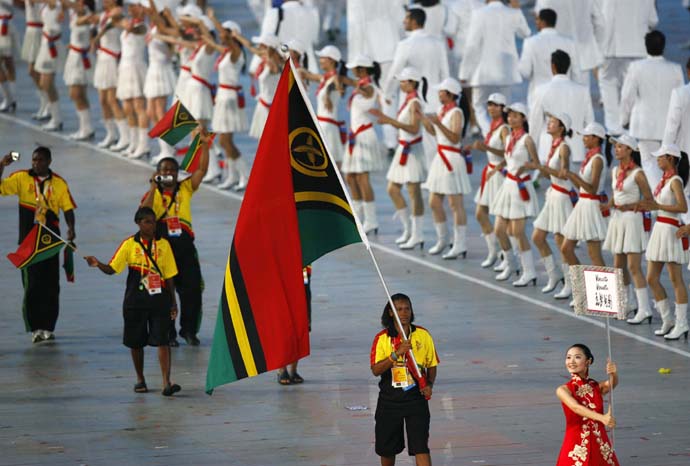 8月8日晚8時,第29屆夏季奧林匹克運動會在國家體育場——“鳥巢”隆重開幕。這是瓦努阿圖代表團在開幕式上入場。