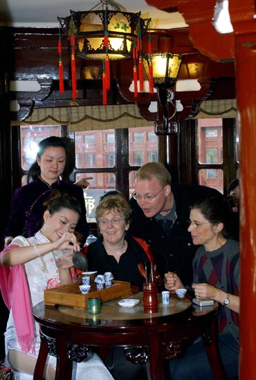 上海旅游形象大使丁曉軍等在“湖心亭”進行茶道技藝練兵。新華社發(fā)
