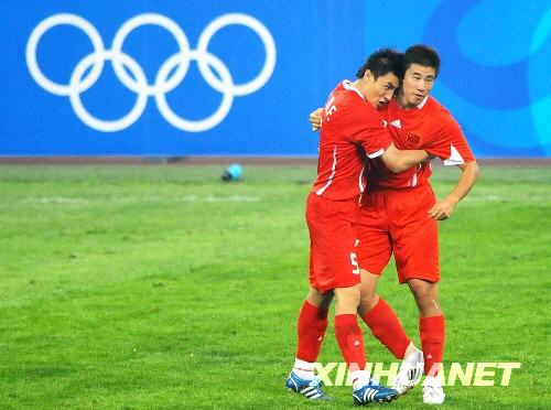 8月7日,中國國奧隊球員李瑋峰(左)與隊友董方卓一同慶祝進(jìn)球。當(dāng)日,在沈陽進(jìn)行的北京奧運(yùn)會男子足球C組的比賽中,中國國奧隊以1比1戰(zhàn)平新西蘭國奧隊。新華社記者