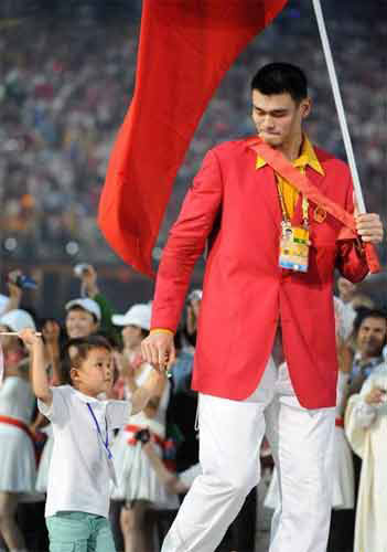 中國(guó)隊(duì)出場(chǎng)了,在場(chǎng)所有人都屏住呼吸,因?yàn)榕c姚明之間的身高差距實(shí)在太大,姚明不能牽著林浩出場(chǎng),林浩就拽著姚明的運(yùn)動(dòng)褲。他拿著兩面小旗幟揮舞著,微笑著回報(bào)會(huì)場(chǎng)上熱烈的掌聲!這時(shí)候,姚明突然俯下身子對(duì)林浩說(shuō):“林浩你多吃點(diǎn)飯吧,以后爭(zhēng)取長(zhǎng)得跟我一樣高!”林浩愣了一下說(shuō):“我要考清華大學(xué)!” 面對(duì)應(yīng)接不暇的閃光燈和鏡頭,林浩一直用笑容回應(yīng)觀眾。開(kāi)幕式結(jié)束后,林浩回到運(yùn)動(dòng)員休息區(qū),很多運(yùn)動(dòng)員為林浩的鎮(zhèn)靜感動(dòng),林浩成為當(dāng)晚休息區(qū)最耀眼的明星,很多運(yùn)動(dòng)員和教練員把他團(tuán)團(tuán)圍住,要求與林浩合影留念,林浩在眾人愛(ài)撫的懷抱中被傳來(lái)傳去。因?yàn)榕c林浩是搭檔,姚明有“天時(shí)地利人和”的優(yōu)勢(shì),他把林浩抱在懷里,誰(shuí)要與林浩合影需要得到他的批準(zhǔn),算是當(dāng)了一回林浩的經(jīng)紀(jì)人,估計(jì)林浩的這位經(jīng)紀(jì)人算是業(yè)內(nèi)身價(jià)最高的吧?直到昨日凌晨4點(diǎn),姚明才把倦意十足的林浩送回房間休息。