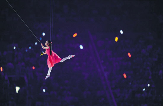 在北京奧運會的開幕式上,一個小女孩兒的出現(xiàn)讓整場演出增添了童趣和浪漫。她就是那個放著風(fēng)箏從“星星鳥巢”上空緩緩飛過的小姑娘朱巧妍。 即將在這個月過9歲生日的小巧妍在雜技界也算是一員“老將”了,來自安徽淮南的小女孩兒5歲便來到沈陽軍區(qū)雜技團學(xué)習(xí)。正是這四年的學(xué)習(xí)生涯為她在“鳥巢”上空自然、淡定的表演奠定了基礎(chǔ)。 其實小巧妍第一次被吊到半空的時候也害怕,那是因為在演出中,她手中的“風(fēng)箏”和她自己是分別被固定在兩個不同的點上的,有的時候兩個“點”走起來不同步,她幼小的身體就會被慣性拽得搖搖晃晃,雖然保護措施非常嚴密,不會出現(xiàn)危險,但在空中晃來晃去,別說是一個小女孩兒,就是一個大人也受不了。 小巧妍非?斓鼐瓦m應(yīng)了這種高空表演,再第一次被吊到半空,稍微調(diào)整了心情之后,小巧妍居然還調(diào)皮地翻起了跟頭,這可讓創(chuàng)意團隊的叔叔阿姨們跌破了眼鏡,這個角色非她莫屬啊。第一次訓(xùn)練,短短10分鐘,小巧妍征服了所有人,完成了一個成年人或許苦練很長時間才能完成的任務(wù)。 在張藝謀的設(shè)想中,這個小女孩兒的出場一定要親切、自然、生活化,不能有表演的痕跡,小巧妍在叔叔阿姨們耐心地輔導(dǎo)下,終于放下了心理包袱,將這段演出完全當(dāng)成了一次游戲,正是這樣,這場演出才達到了預(yù)期的效果。 小巧妍很樂觀,雖然皮膚被曬得黑黑的,但她在排練期間從來不說苦,不說累,在排練場,小巧妍也給其他演員帶來了歡樂,每次她回到地面,總會有其他的叔叔阿姨過來跟她一起玩兒,跟她合影。為了保護小巧妍稚嫩的身體,開幕式空中特技表演總設(shè)計程小東親自出馬,為小巧妍量身設(shè)計了一套舒適、貼身的防護裝備,這樣,鋼絲就不會勒傷這位大家心目中的小天使。 小巧妍也許是唯一一個能從空中“星星鳥巢”的演員了,她告訴我們,地上的“鳥巢”很美。