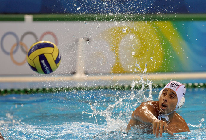 8月10日,西班牙隊(duì)球員戴維·馬丁在比賽中射門。當(dāng)日,北京奧運(yùn)會水球比賽在奧體中心英東游泳館拉開帷幕,首場比賽西班牙隊(duì)以16比6戰(zhàn)勝加拿大隊(duì)。