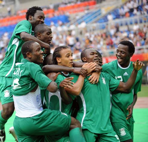 8月10日,尼日利亞隊(duì)球員慶祝進(jìn)球。當(dāng)日,在天津奧林匹克中心體育場舉行的奧運(yùn)會男子小組賽B組比賽中,尼日利亞國奧隊(duì)對陣日本國奧隊(duì)。