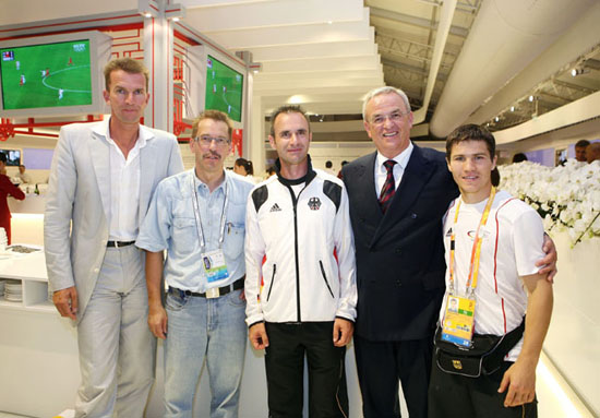 大眾汽車集團(tuán)董事長文德恩教授與參觀大眾主題館的德國奧運(yùn)會(huì)代表團(tuán)運(yùn)動(dòng)員合影。