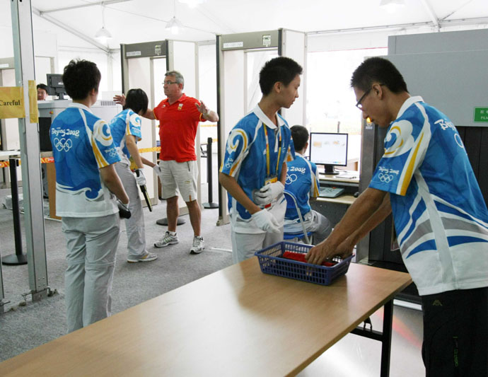 北京奧運(yùn)村的安檢人員在緊張的工作。