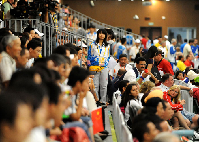 8月11日,志愿者在賽場內(nèi)“監(jiān)督”觀眾文明觀賽。