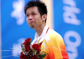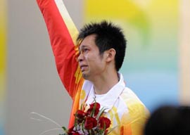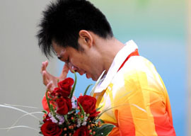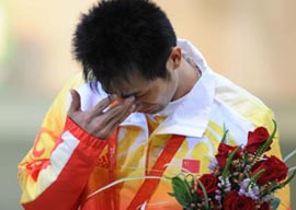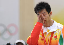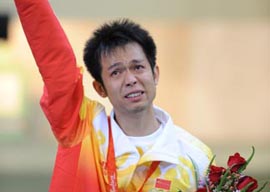 8月11日,中國選手朱啟南在領(lǐng)獎臺上熱淚盈眶。當(dāng)日,在北京奧運會射擊男子10米氣步槍決賽中,印度選手賓德拉奪得金牌,雅典奧運會冠軍、中國選手朱啟南獲銀牌,芬蘭選手哈基寧獲銅牌。