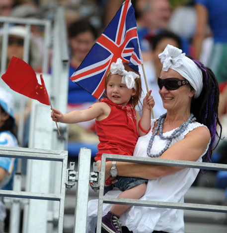 8月11日,一對母女在順義水上公園為皮劃艇激流回旋選手加油助威。
