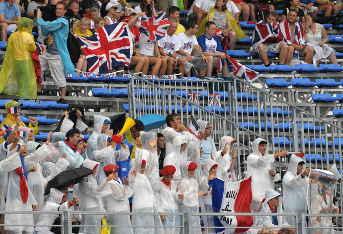 8月11日,觀眾“全副武裝”冒雨在順義水上公園為皮劃艇激流回旋選手加油。