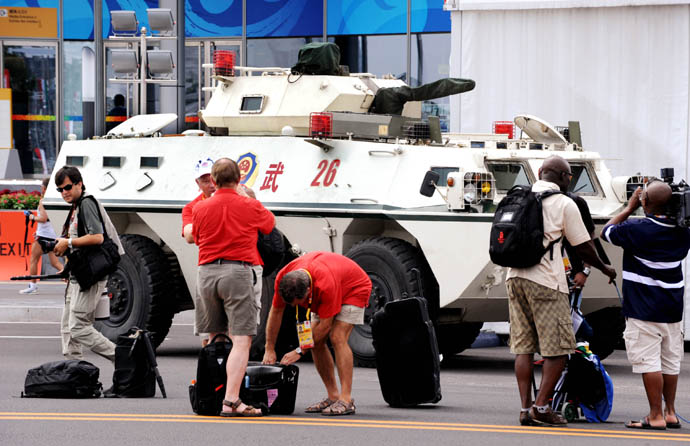 8月12日,記者在拍攝裝甲運(yùn)兵車。當(dāng)日,一輛安保裝甲運(yùn)兵車停在北京奧運(yùn)會(huì)新聞中心(MPC)安檢口,成為媒體關(guān)注的焦點(diǎn)。許多記者還饒有興趣地與之合影留念,感受一下這位“裝甲明星”的威風(fēng)。