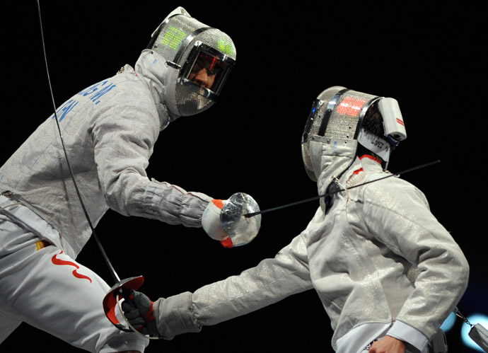 8月12日,中國選手仲滿(左)在國家會議中心擊劍館舉行的北京奧運(yùn)會男子佩劍個人決賽中戰(zhàn)勝法國選手尼古拉·洛佩,獲得冠軍。這是中國男子擊劍在奧運(yùn)歷史上的第一金。