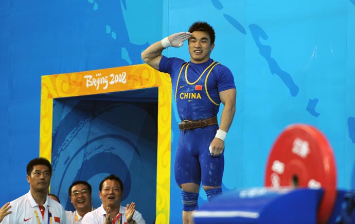 8月12日,中國選手廖輝奪冠后向觀眾行軍禮。當(dāng)日,廖輝在北京奧運會舉重男子69公斤級決賽中以348公斤的總成績獲得金牌。