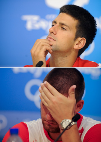 8月13日,在北京奧運會網(wǎng)球男單第三輪比賽中,塞爾維亞選手德約科維奇以2比0戰(zhàn)勝俄羅斯選手尤日內(nèi)。賽后,兩名選手分別出席新聞發(fā)布會,德約科維奇(上圖)與尤日內(nèi)(下圖)的表情透露出當時各自的心情。