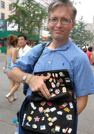8月13日,來自美國的奧運(yùn)會紀(jì)念章收藏者拉里·馬洛尼在北京王府井商業(yè)街展示他收集的奧運(yùn)會紀(jì)念章。 據(jù)介紹,拉里多次到奧運(yùn)主辦城市收集奧運(yùn)會紀(jì)念章,目前已收集了各式奧運(yùn)會紀(jì)念章5000多枚。北京奧運(yùn)會賽事期間,建立了四個官方奧運(yùn)紀(jì)念章交換中心,吸引了眾多中外紀(jì)念章愛好者前來交流。