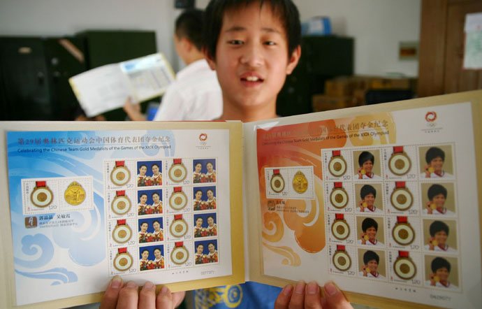 8月13日,安徽巢湖的一名集郵愛好者展示購買到的“金牌運(yùn)動(dòng)員”即時(shí)版?zhèn)性化郵折。中國集郵總公司在北京奧運(yùn)會期間發(fā)行“金牌成就夢想”第29屆奧林匹克運(yùn)動(dòng)會中國體育代表團(tuán)奪金紀(jì)念郵品(簡稱“金牌運(yùn)動(dòng)員”郵品),包括“金牌運(yùn)動(dòng)員”即時(shí)版?zhèn)性化郵折和“金牌運(yùn)動(dòng)員”紀(jì)念封,個(gè)性化郵折力爭在運(yùn)動(dòng)員獲得金牌后48小時(shí)內(nèi)發(fā)行銷售,受到廣大集郵愛好者的青睞。