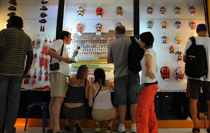 8月13日,外國客人在秀水街挑選中國傳統(tǒng)工藝品。
