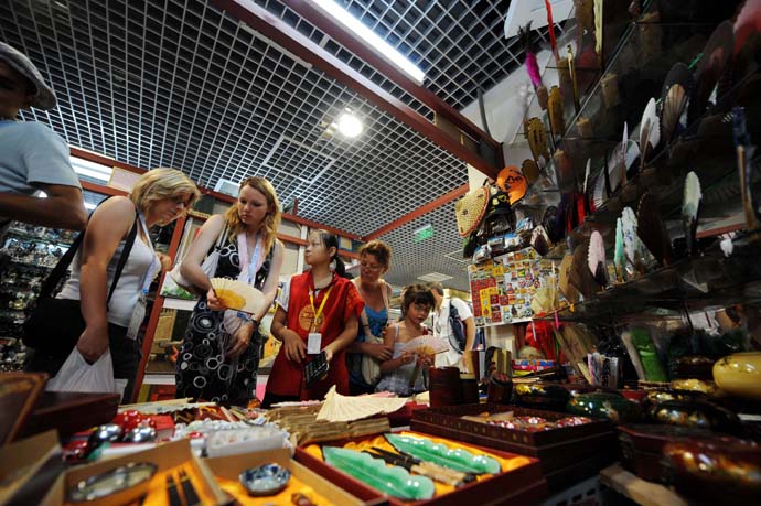 8月13日,國(guó)外游客在北京秀水街挑選中國(guó)傳統(tǒng)工藝品。
