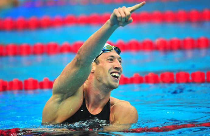 奧運(yùn)會(huì)男子100米自由泳決賽中,“背水一戰(zhàn)”的法國(guó)選手貝爾納獲得金牌。
