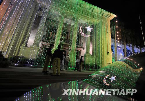 8月13日,巴基斯坦警察站在拉合爾的旁遮普省議會(huì)大樓外。當(dāng)晚,不少建筑物“盛裝打扮”,營(yíng)造出美麗的夜景輪廓,迎接第二天到來(lái)的巴基斯坦獨(dú)立61周年紀(jì)念日。新華社/法新