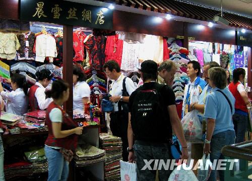 8月14日,外國游客在北京秀水街挑選絲綢服裝。秀水街是中國改革開放以來北京一處聞名中外的服裝和工藝品市場,這里物美價(jià)廉的商品深受國內(nèi)外游客喜愛,其“絲綢街”的絲綢更是受到外國游客的青睞。