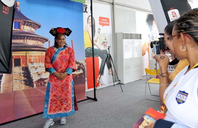 8月14日,來(lái)自薩爾瓦多的賓客在北京奧運(yùn)村商業(yè)文化街身穿中國(guó)古代服飾拍照留念。