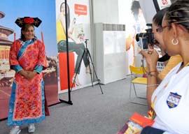 北京奧運(yùn)村商業(yè)文化街照相館里的中國(guó)古代服飾受到外國(guó)賓客的青睞。