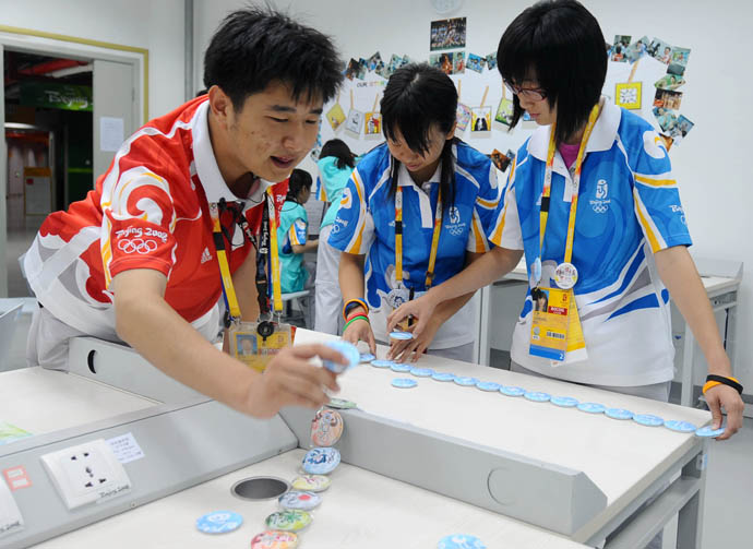 8月12日,參與志愿者崗位標(biāo)識徽章設(shè)計的任煒、吳雪楊、于婧(從左至右)等在整理志愿者崗位標(biāo)識徽章。