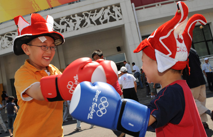 8月15日,兩個(gè)即將觀看北京奧運(yùn)會(huì)拳擊比賽的小朋友,在拳擊比賽場館——工人體育館外戴著拳套玩耍。