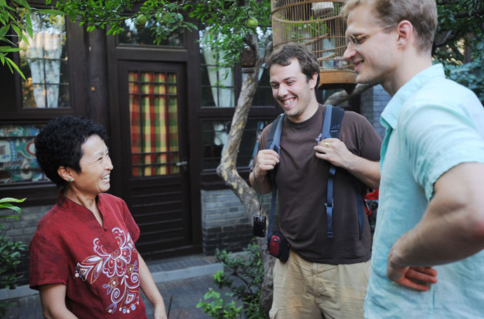 8月15日,什剎海大金絲胡同12號“奧運(yùn)人家”女主人王志喜用流利的英文向美國游客介紹中國建筑文化。8月8日北京奧運(yùn)會開幕后,北京市的“奧運(yùn)人家”成為中外游客的關(guān)注焦點(diǎn)。位于什剎海附近的“奧運(yùn)人家”游客絡(luò)繹不絕,游客在這里能夠深切感受到老北京所特有的皇城文化與傳統(tǒng)特色。