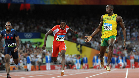 一股黑色旋風瞬間掠過“鳥巢”的紅色跑道,牙買加“奇人”博爾特最終用實力證明他是世界上跑得最快的人。 16日晚,在全場驚爆的歡呼聲中,他僅用了9秒69的時間到達了100米跑道的終點,并刷新了自己2個多月前創(chuàng)下的9秒72的世界紀錄,一舉奪得北京奧運會男子100米冠軍。 特立尼達和多巴哥的湯普森以9秒89摘得銀牌;美國人迪克斯贏得銅牌,成績?yōu)?秒91。 16日晚在“鳥巢”內(nèi)上演的“飛人大戰(zhàn)”決賽,幾乎成了博爾特一個人的表演。而就在兩個多月前,博爾特剛以9秒72打破了鮑威爾9秒74的世界紀錄。 在半決賽中跑出9秒85的博爾特,當晚站在“飛人大戰(zhàn)”決賽第4道。決賽中,22歲的博爾特并未給對手以機會,如同離弦之箭第一個沖向百米跑道的終點。 他的同胞、前世界紀錄保持者鮑威爾則排名第五,成績?yōu)?秒95。 半決賽16位選手中,有6位跑進了10秒大關,進入男子100米決賽的門檻為10秒03。賽前的奪冠熱門、美國“飛人”蓋伊在半決賽中僅跑出10秒05的成績,排位小組第五,無奈憾別“飛人大戰(zhàn)”決賽跑道。