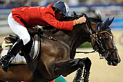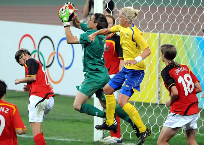 8月15日,德國隊守門員娜丁·安格雷爾門前化險。當(dāng)日,在沈陽奧體中心舉行的北京奧運會女足四分之一決賽中,德國隊以2比0戰(zhàn)勝瑞典隊,成功晉級。