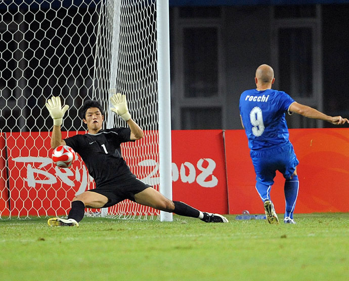 8月10日,韓國隊(duì)守門員鄭勝龍(左)未能撲救出意大利隊(duì)球員托馬索·羅基的進(jìn)球。當(dāng)日,在秦皇島市奧體中心體育場(chǎng)舉行的奧運(yùn)會(huì)男子小組賽D組比賽中,意大利隊(duì)以3比0戰(zhàn)勝韓國隊(duì)。