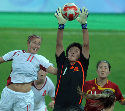 8月10日,中國(guó)隊(duì)守門員張艷茹在比賽中摘球。當(dāng)日,在天津奧林匹克中心體育場(chǎng)舉行的北京奧運(yùn)會(huì)女足小組賽中,中國(guó)隊(duì)與加拿大隊(duì)1比1戰(zhàn)平。