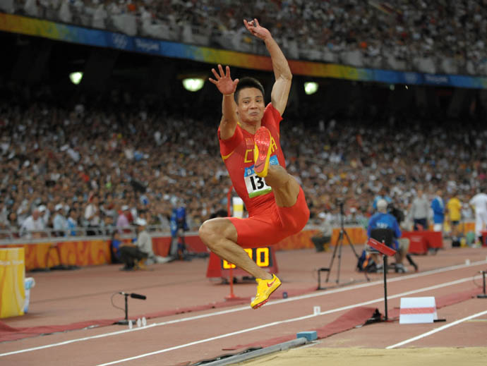 8月16日,中國(guó)選手李潤(rùn)潤(rùn)在男子跳遠(yuǎn)及格賽中。當(dāng)日,北京奧運(yùn)會(huì)田徑比賽在國(guó)家體育場(chǎng)“鳥(niǎo)巢”繼續(xù)進(jìn)行。