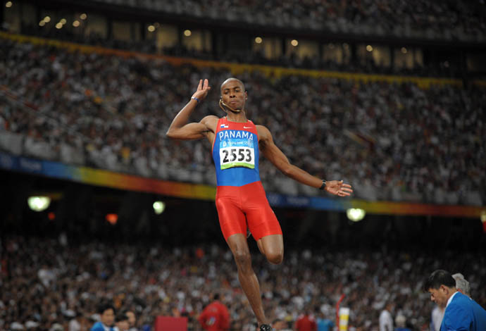 8月16日,巴拿馬選手歐文·哈伊爾·薩拉迪諾·阿蘭達在男子跳遠及格賽中。當(dāng)日,北京奧運會田徑比賽在國家體育場“鳥巢”繼續(xù)進行。