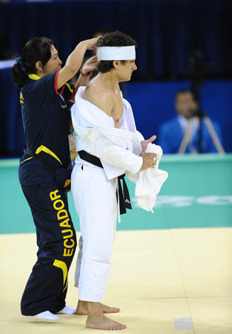 8月10日,在北京奧運會柔道男子66公斤級淘汰賽中,厄瓜多爾選手伊巴涅斯在比賽中受傷,他在接受簡單的醫(yī)療處理后繼續(xù)投入比賽。